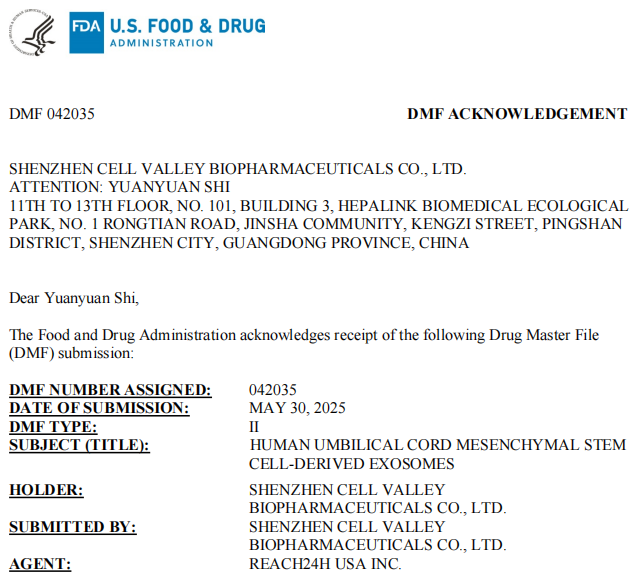 深圳細胞谷外泌體獲美國FDA DMF備案